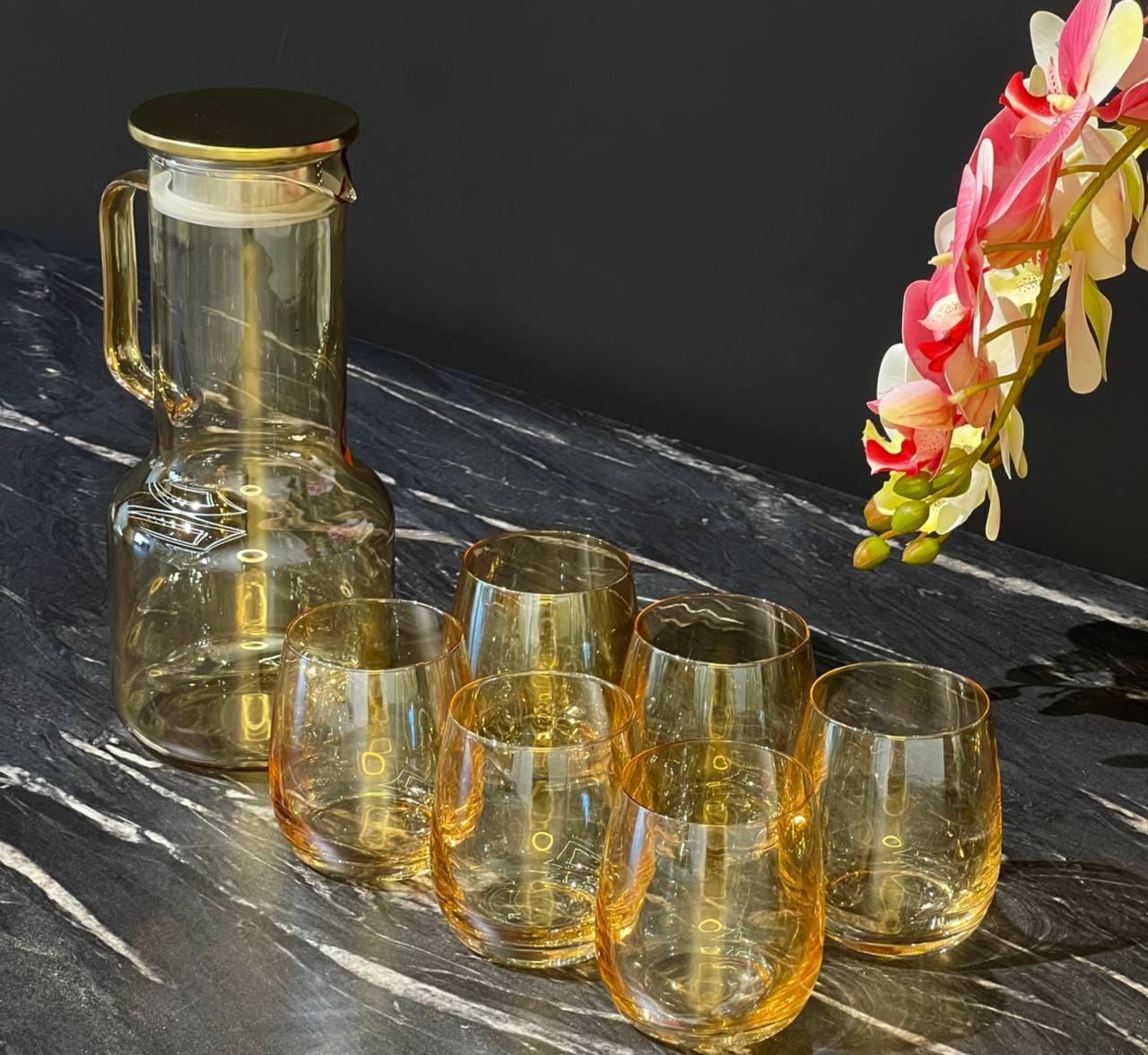 طقم ماء مكون من سبع قطع، ويحتوي على إبريق وستة أكواب، مصمم لتقديم المشروبات.